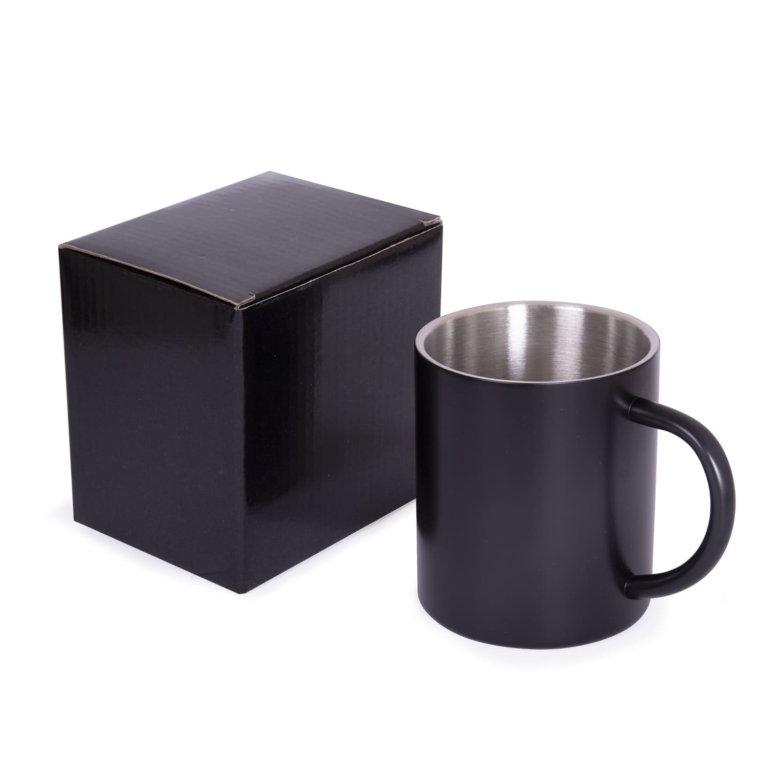 Кружка металева з двома стінками: срібляста – з глянцевим покриттям, кольорові (чорна, синя, олива) – з матовим покриттям. Висота 9,2 см Кожна кружка в індивідувльній, чорній подарунковій коробці. Розмір індивідуальної коробки: 10,8 х 10,8 х 8,3 см. Мити тільки вручну, щоб не пошкодити кольорове покриття.
