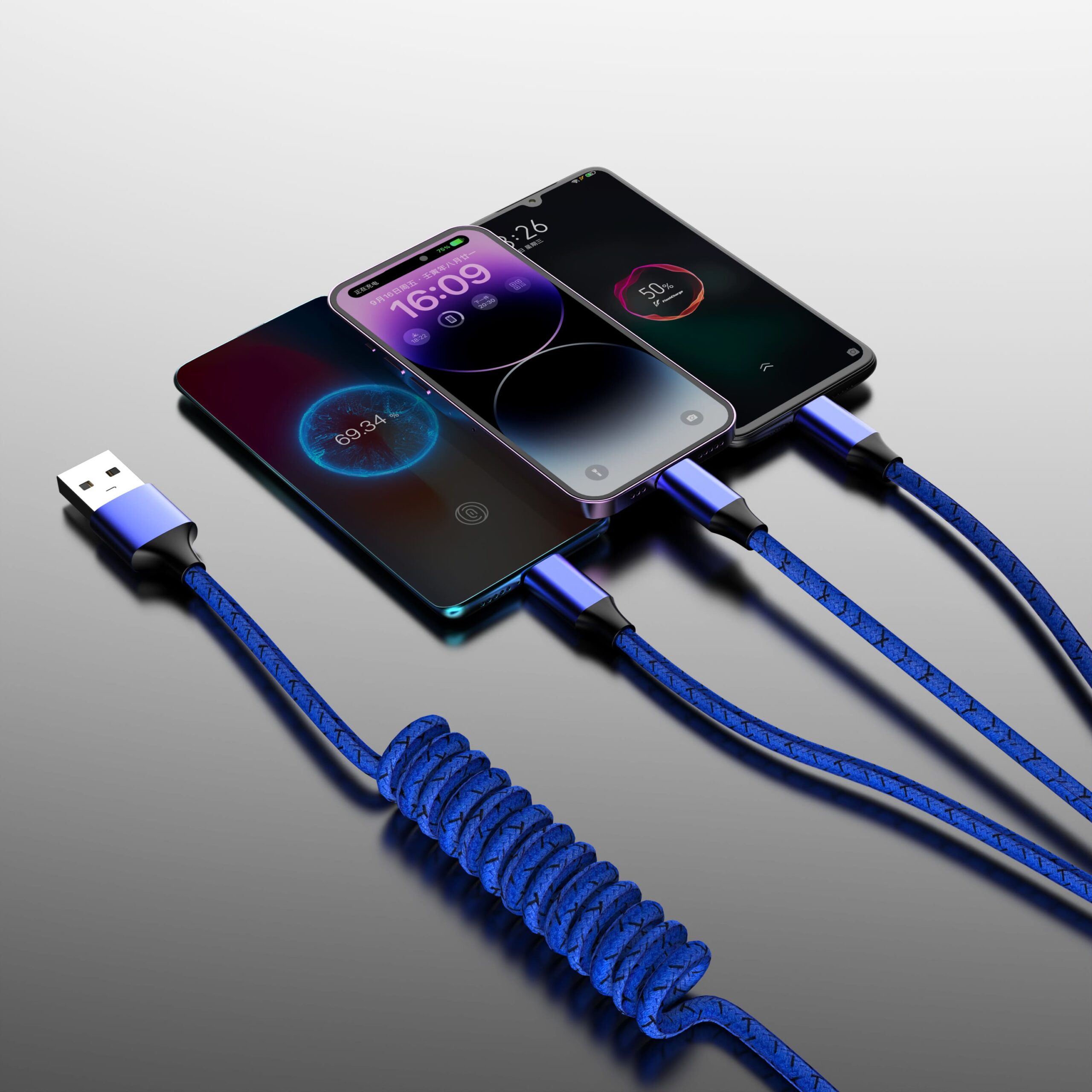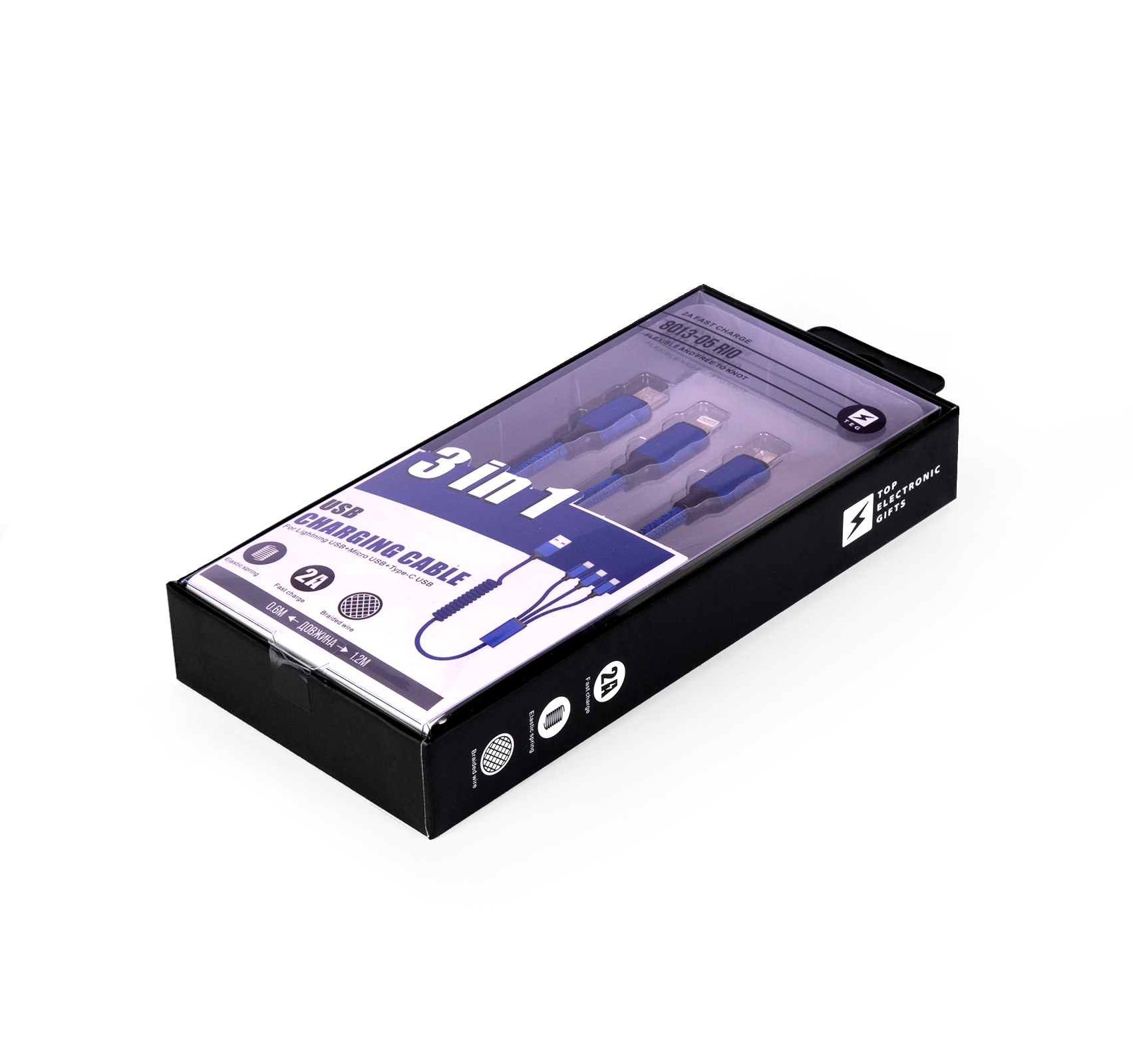 Універсальний кабель 3-в-1 для зарядки гаджетів, довжина в розтягнутому стані 1,2 м. Має стандартний USB вхід для підключення живлення та три різні виходи Lightning + Mscro USB + Type-C.