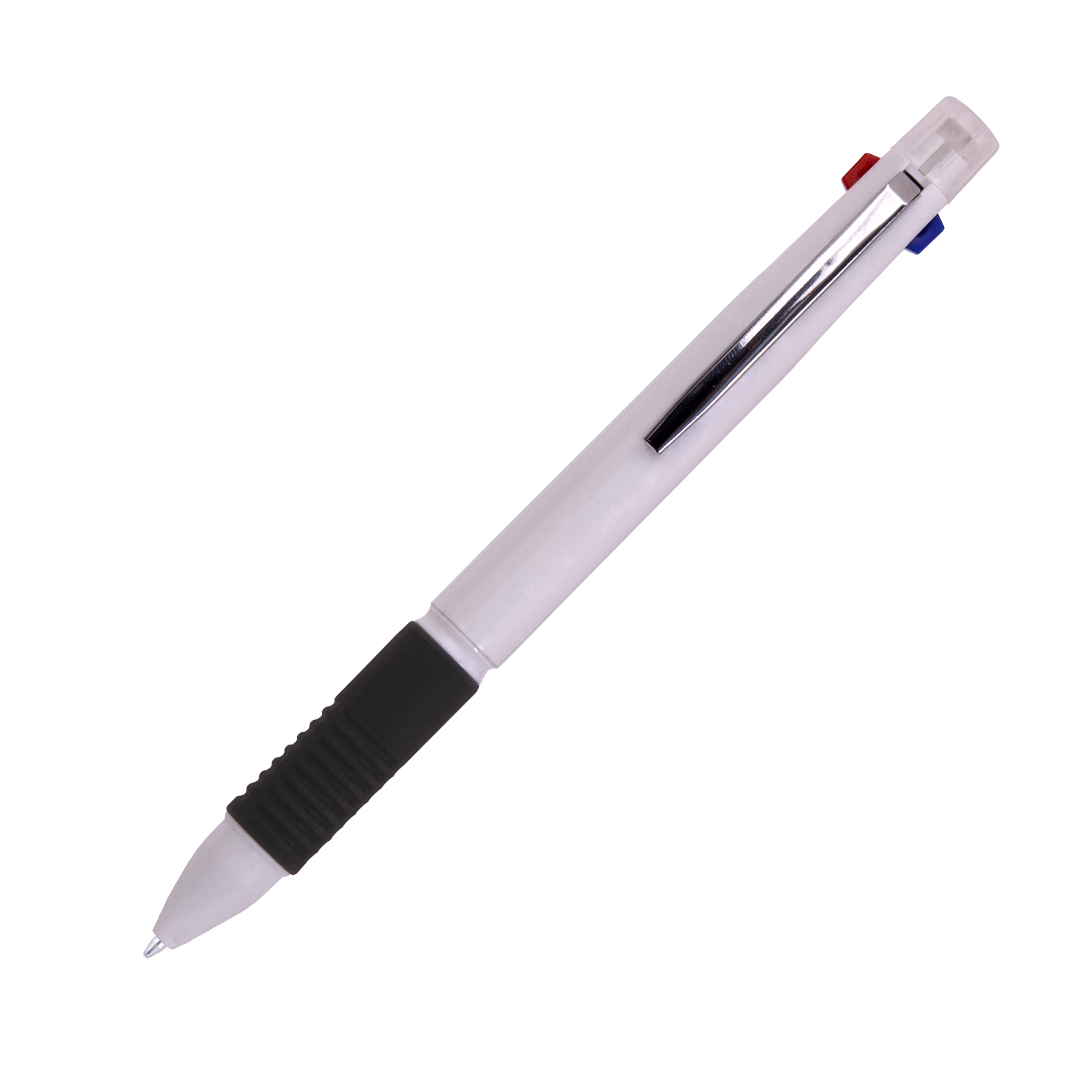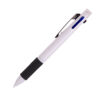 Ручка кулькова багатофункціональна 4 в1 Mumbai з білим корпусом. м’якою силіконовою резинкою, для зручного тримання в руці. Чотири функції в одній ручці: чорне, синє та червоне чорнила та олівець, на кінчику гумка для олівця.