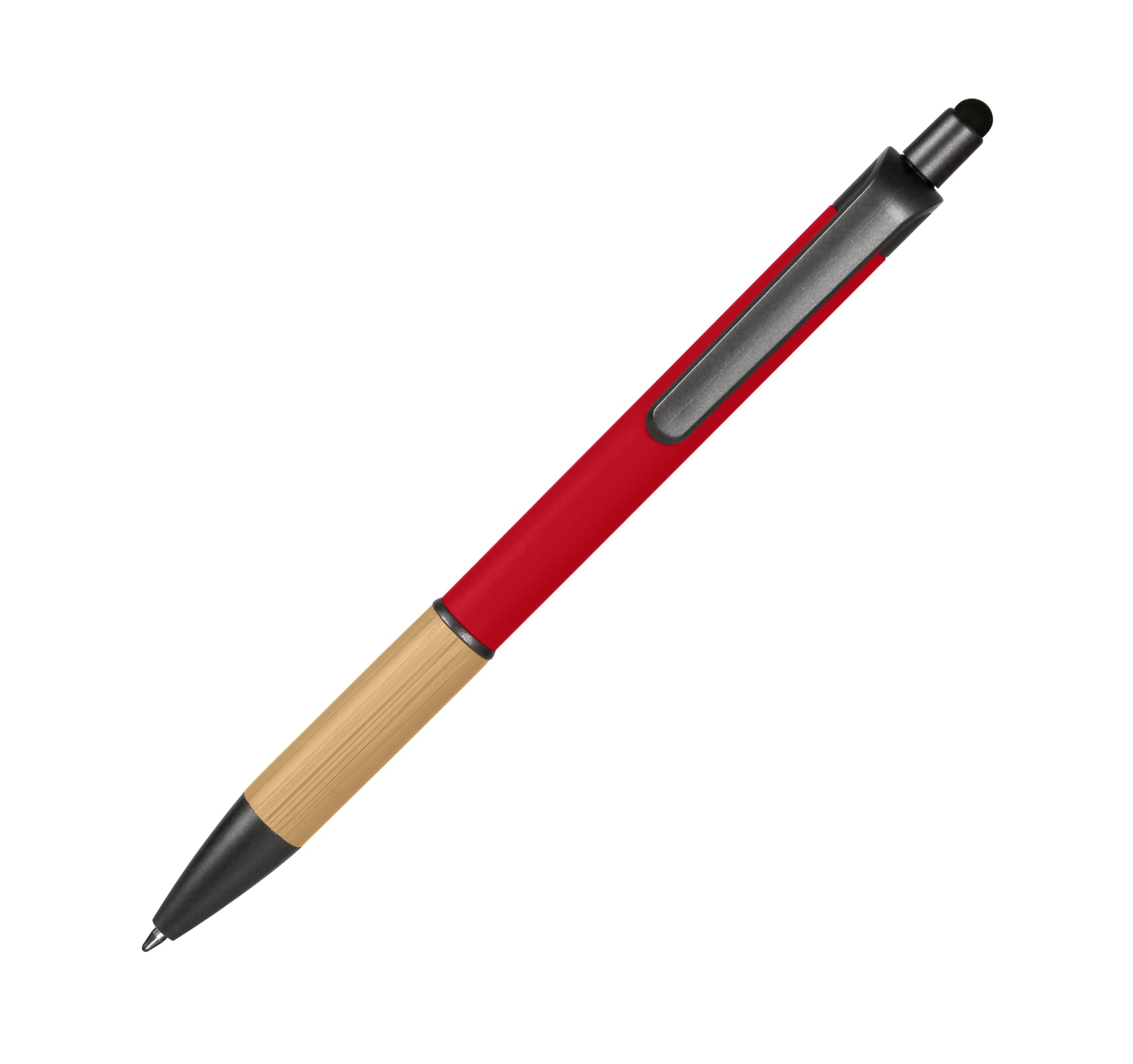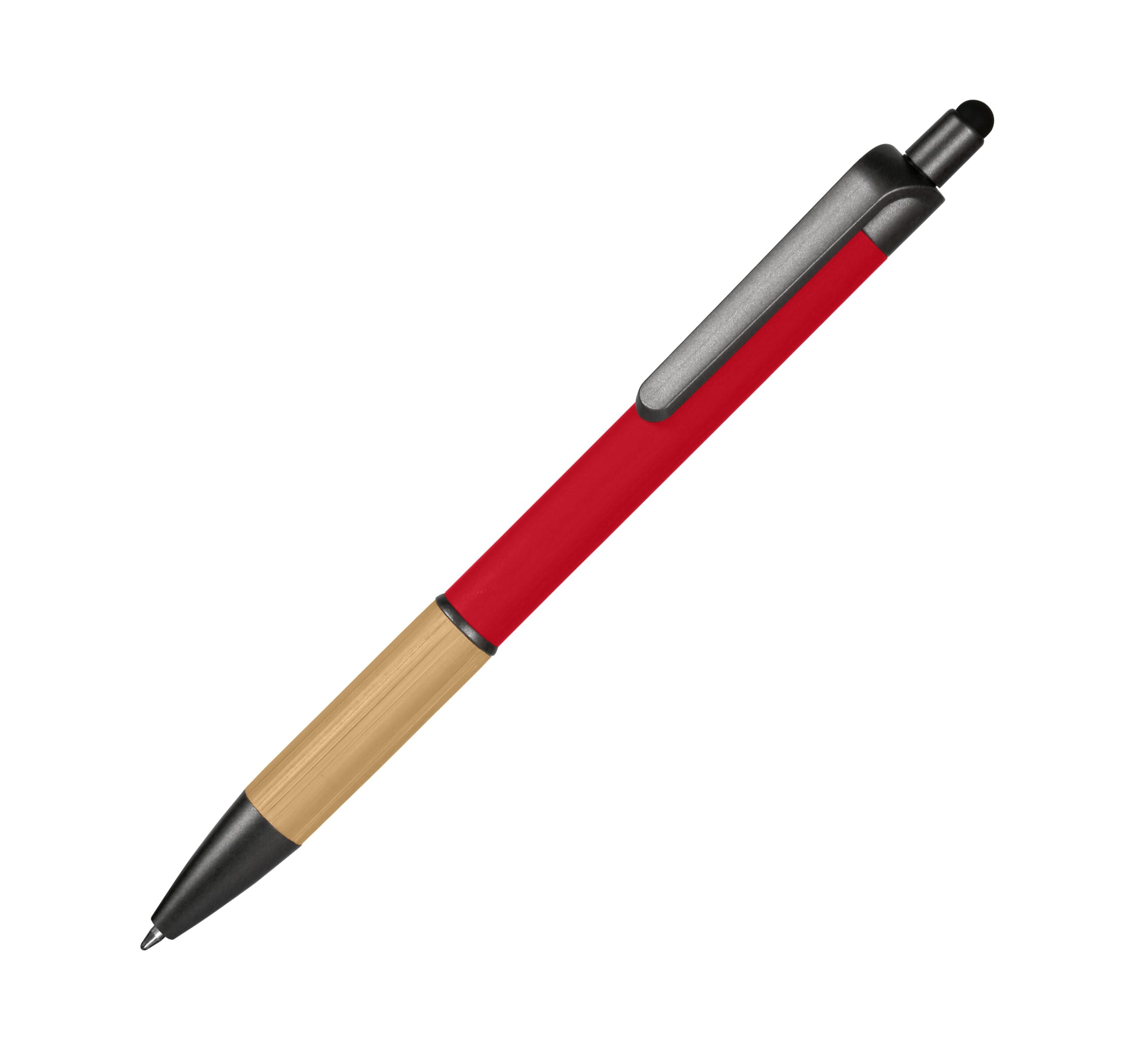 Ручка-стилус кулькова, корпус металевий з покриттям софт-тач, бамбукова вставка, кліп з пластику. Стержень з синім чорнилом. Рекомендований метод нанесення – гравіювання, УФ-друк.